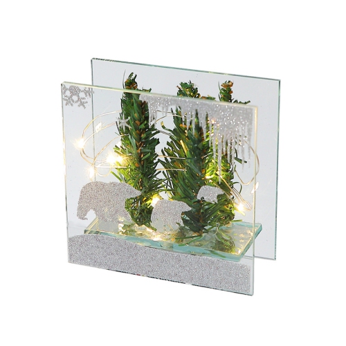 Ce beau stand de verre LED d'ours de la forêt d'hiver peut orner votre belle maison. Constitué d'un matériau en verre, il est décoré avec deux verres parallèles combinés avec des impressions en forme d'ours gravés sur le verre. Il a également des feuilles vertes qui complètent le look clair cristal. Les lumières LED complètent le look quand les lumières support en verre vers le haut.