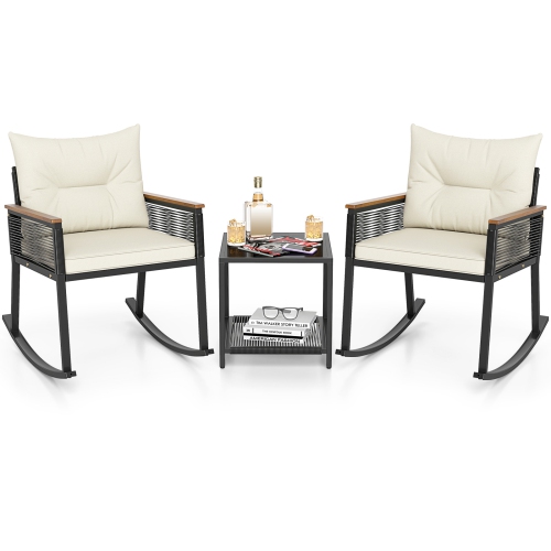 Gymax 3 PCS Patio Rocking Bistro Set Outside Wicker Rockers w/ 2-Tier Tempered Glass Coffee Table
