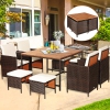 Ensemble de 9 éléments pour diner : L’ensemble de salle à manger de terrasse comprend une table à manger, 4 fauteuils et 4 poufs, permettant de nombreuses places assises pour organiser une soirée repas et épater vos convives. En complément, les sièges sont pourvus de doux coussins rembourrés d’éponge épaisse. Les fauteuils, quant à eux, présentent des dossiers larges et des accoudoirs pour vous donner l’expérience d’assise la plus confortable possible.