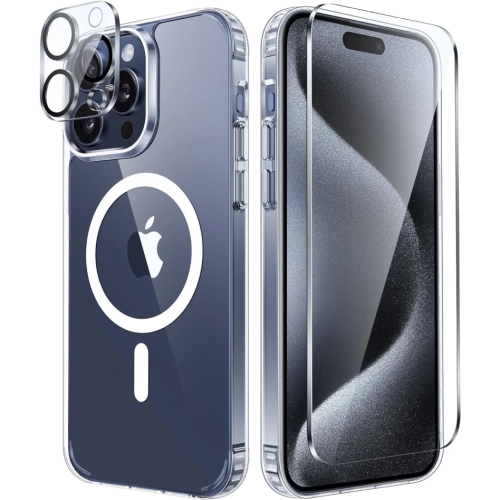 iPhone 15 Pro, protecteur transparent, support de chargement magnétique, protection de qualité militaire contre les chutes, anti-jaunissement, étui antichoc durable de 6,1 po