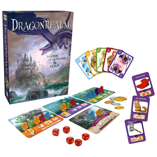 Osez vous aventurer au-delà de la forêt de Dragonwood dans le jeu de société Dragonrealm - A Game of Goblins & Gold de Gamewright. Collectionnez des cartes d'aventurier pour obtenir des dés et utilisez ceux-ci pour explorer les royaumes mystérieux de Dragonrealm. Revendiquez le trésor en mettant la plupart des aventuriers au même endroit. Mais faites attention aux vilains gobelins.