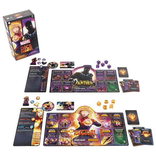 Combattez en tant que Captain Marvel et Black Panther dans le jeu de société Marvel Dice Throne. Cet ensemble de deux héros comprend un ensemble unique de dés, un plateau de jeu et un paquet de cartes pour Captain Marvel et Black Panther. Vous attaquerez à tour de rôle vos adversaires et accumulerez des points de combat à dépenser stratégiquement sur des cartes d'action et des mises à niveau.