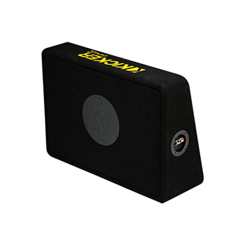 Le boîtier de haut-parleur d'extrêmes graves compact de 10 po de CompC est équipé d'un seul terminal de 2 ohms. Le tapis noir épais protège le boîtier. Logo de KICKER brodé