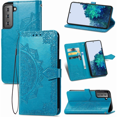 Ledex Luxe cuir cuir fleur Mandala étui portefeuille cuir polyuréthane Premium SKYXD Luxury 3D pour Samsung Galaxy S22 (Bleu)