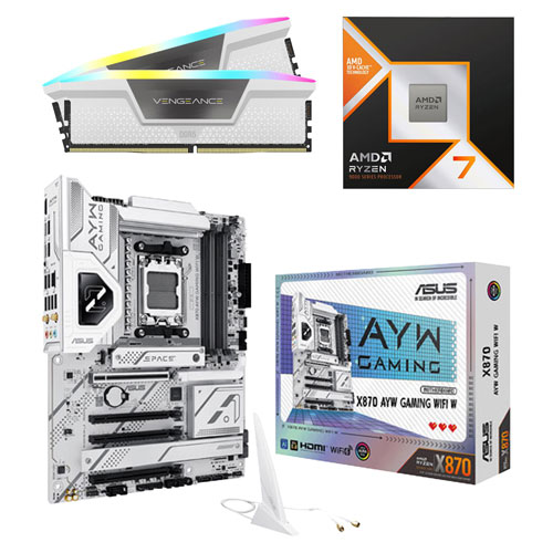 Améliorez la performance de votre ordinateur grâce à cet ensemble, qui comprend la mémoire vive Vengeance RGB de 64 Go de Corsair pour ordinateur de bureau, le processeur Ryzen 7 d'AMD et la carte mère ATX X870 AYW d'ASUS.
