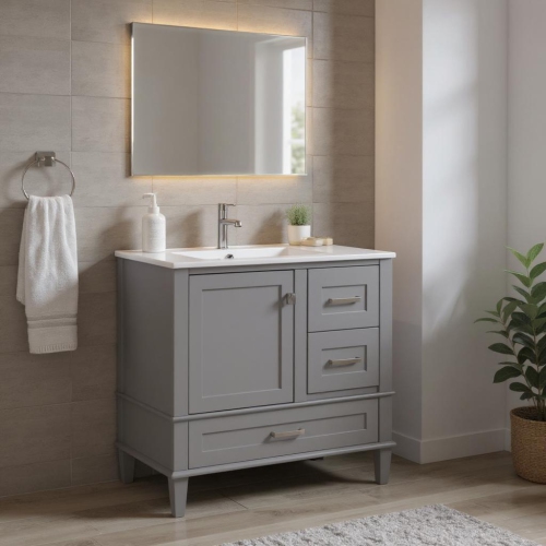 Le meuble-lavabo blanc Homy Casa 36 po offre un style épuré et élégant qui s'harmonise aux intérieurs de salle de bain modernes. Doté d'un grand espace de rangement avec des tiroirs à fermeture en douceur, ce meuble est idéal pour ranger les articles essentiels de la salle de bain tout en embellissant votre espace.