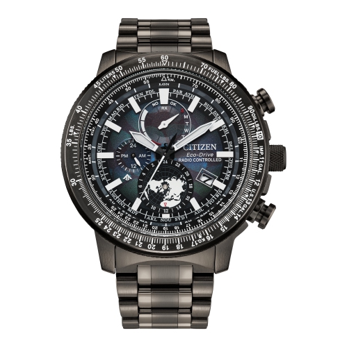 3 aiguilles; heure mondiale en utilisant le disque de l'hémisphère Nord (dans le sens antihoraire); Antimagnétique; heures; minutes; indication de la date et de la réserve d'énergie; commande radio