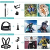L'emballage comprend tous les éléments suivants:1 x montage de la sangle de la ceinture de tête 1 x montage de la sangle de la ceinture de poitrine 2 x montage de la sangle du poignet 1 x montage du porte - sac rotatif à 360 degrés 1 x montage du support de la poignée de bicyclette2 x adaptateur de montage de la poignée de bicyclette 1 x montage de la ventouse de voiture 2 x adaptateur de ventouse de voiture 1 x monopied de poignée extensible2 adaptateurs à pied simple à poignée 1 poignée flottante 2 boucles de libération rapide de surface2 x surface J Hook 2 x Finger Screw 1 x wrenc
