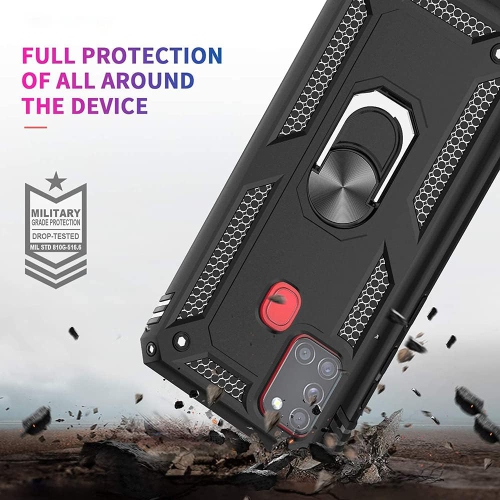 Pour étui A21s de Samsung + protecteur d'écran en verre trempé, béquille en anneau de rotation à 360 degrés de qualité militaire