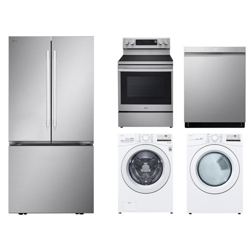 Réfrigérateur à deux portes 25 pi³ 33 po; Cuisinière électrique; Lave-vaisselle; Laveuse à chargement frontal; Sécheuse de LG - Acier inoxydable/Blanc