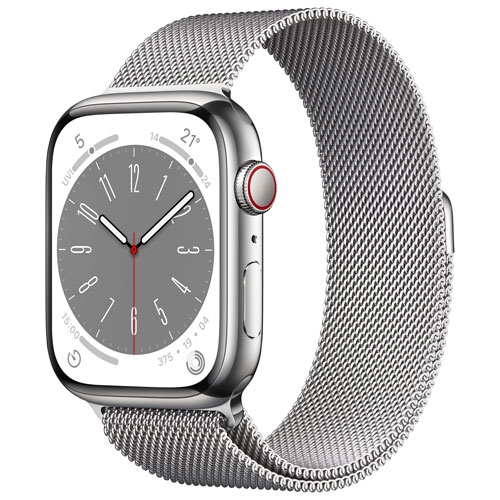Remis à neuf (État correct) - Apple Watch Series 8 (GPS + cellulaire) avec boîtier 45 mm en acier inoxydable argenté et bracelet milanais argenté