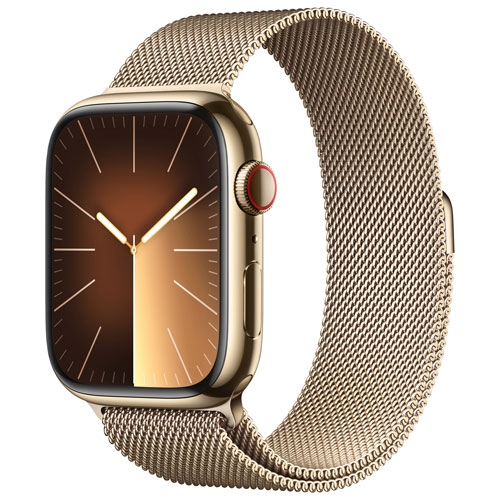 Remis à neuf (très bon état) - Apple Watch Series 9 (GPS + cellulaire) 45 mm avec boîtier en acier inoxydable doré et bracelet milanais doré