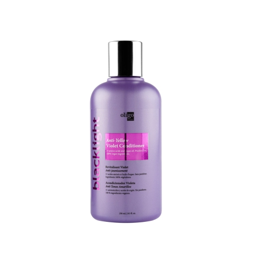 Le revitalisant anti-violet Olivo Blacklight, formulé pour les cheveux blonds, blanchis, blancs et naturels, élimine les tons jaunes, la brunante et rafraîchit les reflets estompées laissant les cheveux plus propres et plus clairs : élimine les tons jaunes, la brussicité et rafraîchit les tons pâles intenses avec 11 acides aminés et l’argan omprouve.