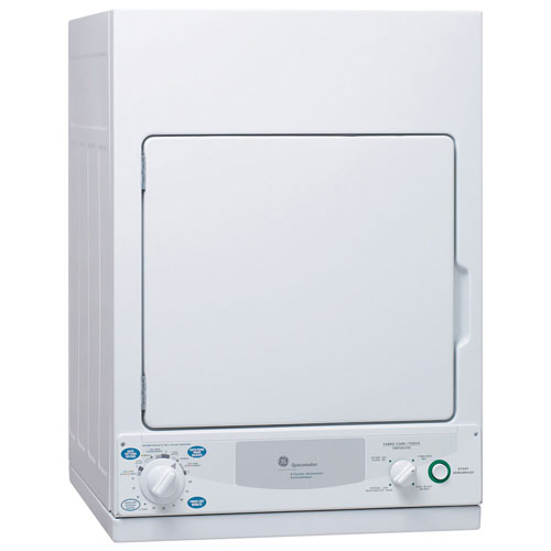 La sécheuse électrique à chargement frontal SpaceMaker de GE est un modèle compact idéal pour les petites salles de lavage, avec une capacité respectable de 3,6 pi³ qui convient aux petites brassées. Ses 4 cycles de séchage permettent d'obtenir d'excellents résultats chaque fois, et incluent un cycle de séchage rapide qui permet de sécher un ou deux articles en un temps record.Sécheuse électrique de 3,6 pi³ Spacemaker de GE (PCKS443EBWW) - Blanc - Boîte ouverte - Parfait état