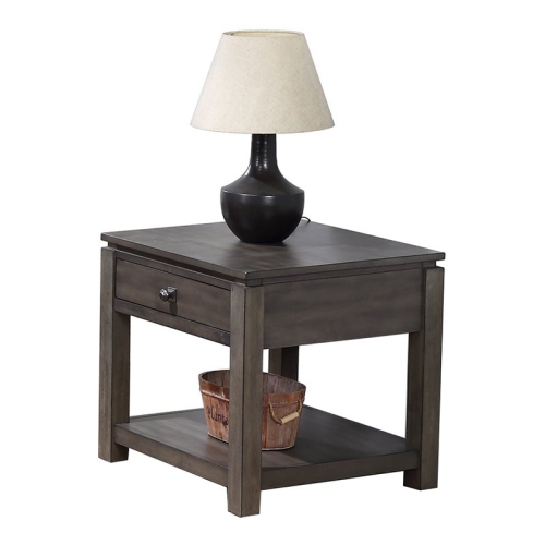 Table d’extrémité en bois gris avec tiroir et tablette au fini gris coucher de soleil