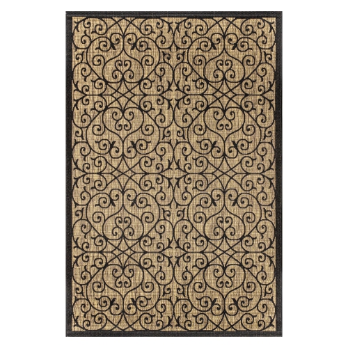 Avec son motif en filigrane inspiré du fer forgé espagnol, notre tapis Boho-chic ajoute un style éclectique à un porche extérieur ou à un patio. Les tons variés de beige et de brun mêlés avec un motif noir donnent à ce tapis un style rétro tissé à la main.