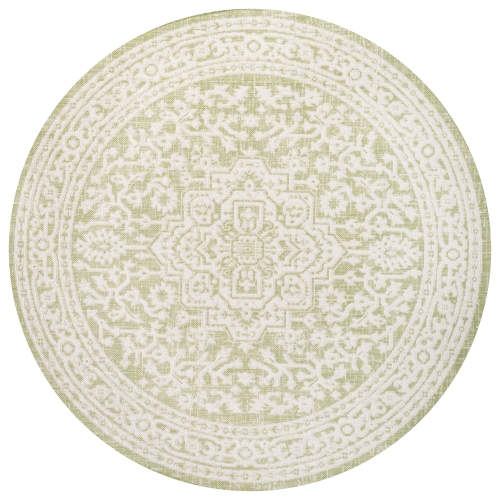 Le motif vivant de ce tapis décoratif en médaillon ajoute un style exotique à un porche extérieur ou à un patio. Les tons variés de vert doux combinés avec un motif crème donnent à ce tapis une allure rétro tissée à la main.