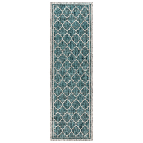 Notre design géométrique populaire est inspiré par les motifs de tuiles marocaines. Ce tapis classique ajoute un style éclectique à un porche extérieur ou à un patio. Les tons mélangés de bleu sarcelle foncé et le motif de treillis gris pâle en doucine donnent à ce tapis une texture tissée à la main.