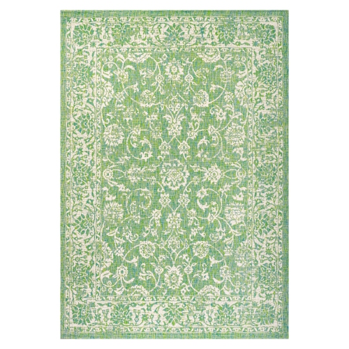 Avec un motif de vigne et de bordure inspiré des tapis persans, notre tapis bohème chic ajoute un style éclectique à un porche ou à un patio extérieur. Les tons variés de vert mêlés avec un motif taupe donnent à ce tapis une allure rétro tissée à la main.