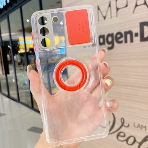 TopSave Coloré Fenêtre Coulissante Objectif De Caméra De Protection Clair TPU Téléphone Cas avec Support Anneau Couverture Pour Samsung Galaxy S21 FE, Rouge