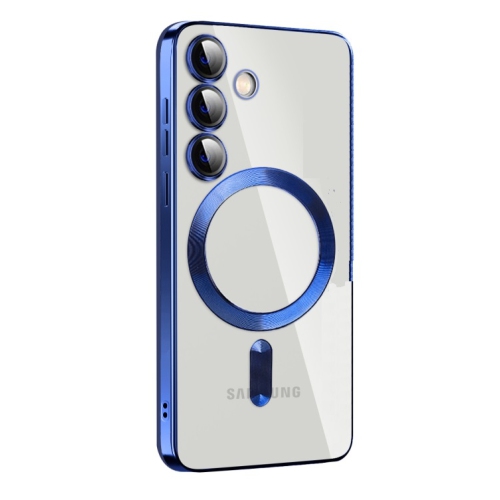 TopSave – Étui souple transparent pour Samsung Galaxy S25 Plus 6,7 po, objectif de caméra, protection complète, avec MagSafe, étui antichoc en TPUR électroplaqué, bleu foncé