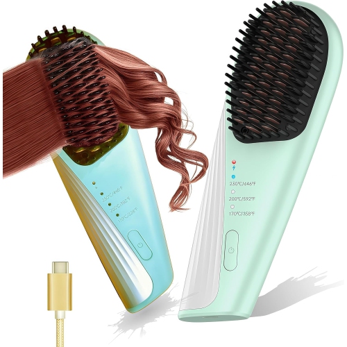 [Vert] Peigne lissant sans fil, fer plat à ions négatifs, fer à friser à double usage droit et bouclé, fer à lisser portatif