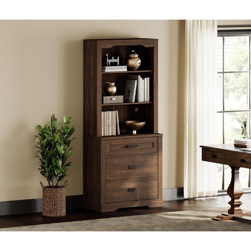 WAMPAT – Bibliothèque à 3 niveaux avec 3 tiroirs, bibliothèque haute de 73,3 po avec 3 tablettes ouvertes pour la chambre, le salon et le bureau à domicile, brun