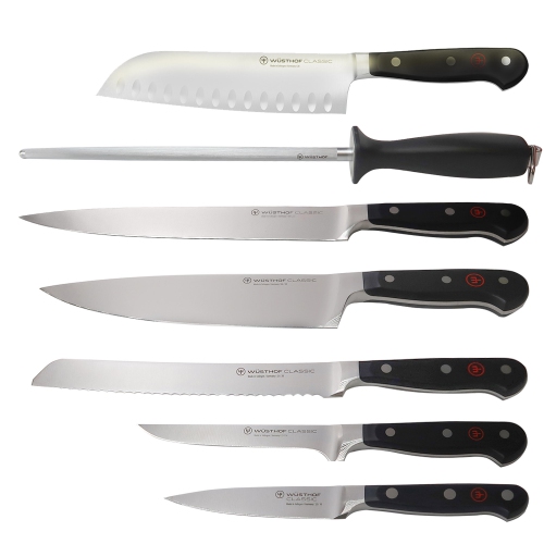 Ensemble de couteaux de chef de 6 pièces avec manches en polypropylène synthétique à trois rivets et soie complète qui résistent à la décoloration, à la décoloration, à la chaleur et aux chocs. La série WÜSTHOF Classic a été notre série la plus vendue.