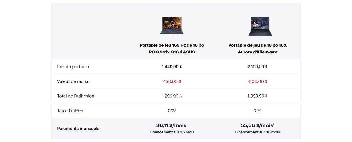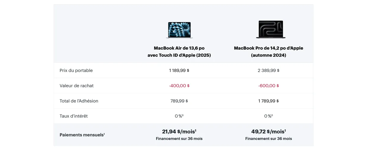 Faites une demande auprès de notre partenaire de confiance la MD La Fairstone Financière Inc pour obtenir le financement de votre nouveau portable. Si votre demande est approuvée, vous profiterez de paiements mensuels modiques pendant 36 mois, basés sur le prix de votre appareil, moins la valeur de rachat¹.