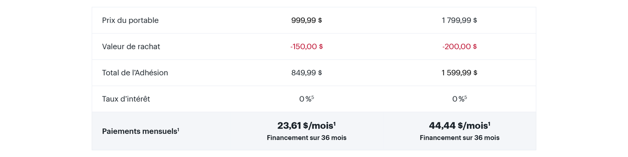Faites une demande auprès de notre partenaire de confiance MD La Fairstone Financière Inc. pour obtenir le financement de votre nouveau portable. Si votre demande est approuvée, vous profiterez de paiements mensuels modiques pendant 36 mois, basés sur le prix de votre appareil, moins la valeur de rachat¹.