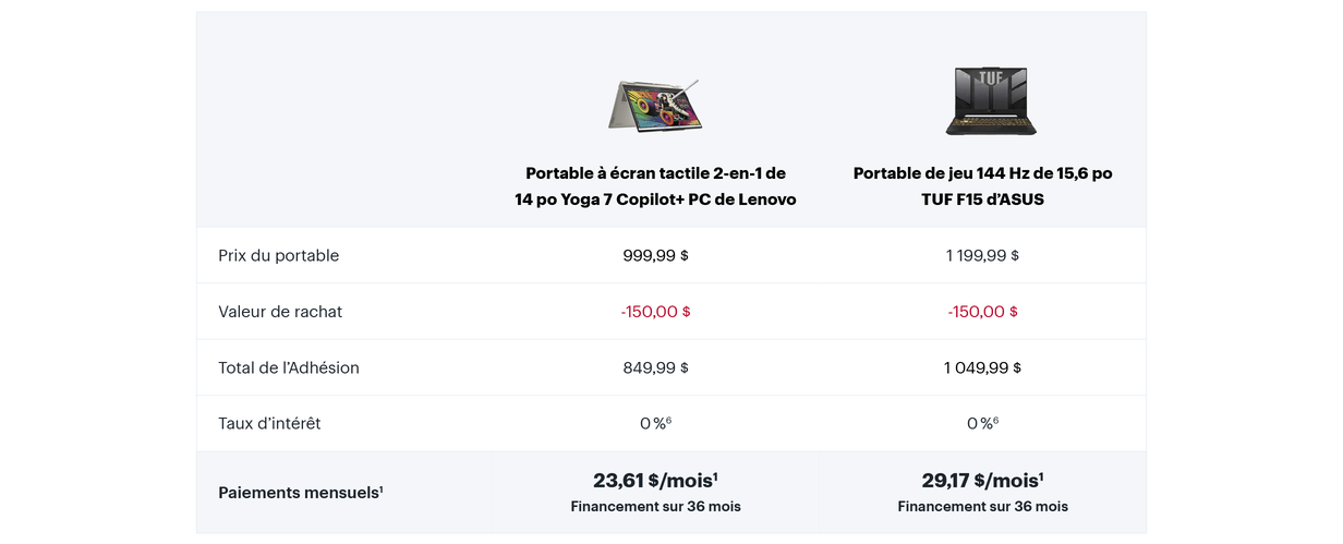 1 Sur approbation de crédit. Des conditions s'appliquent. Crédit fourni par la Financière Fairstone Inc. Plus les frais d'administration de 129,99 $, les écofrais et les taxes. Durée de paiement de 36 mois. Payez intégralement le solde avant la date d'échéance pour éviter les intérêts à un taux d'intérêt annuel de 31,99%.